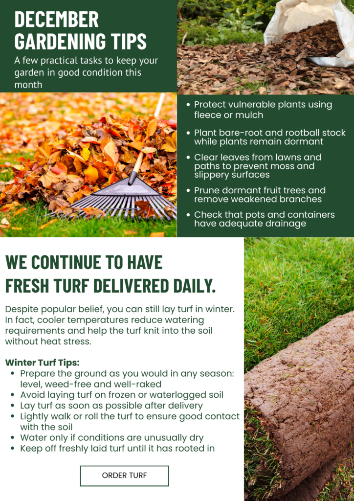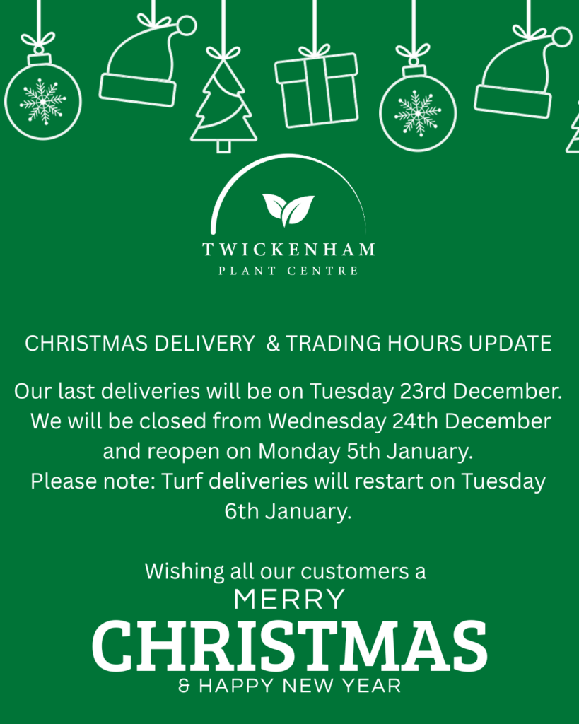 Christmas Update – Twickenham Plant Centre Our last deliveries will be on Tuesday 23rd December.We will be closed from Wednesday 24th December and reopen on Monday 5th January. Please note: Turf deliveries will restart on Tuesday 6th January. Wishing all our customers a Merry Christmas and a Happy New Year!