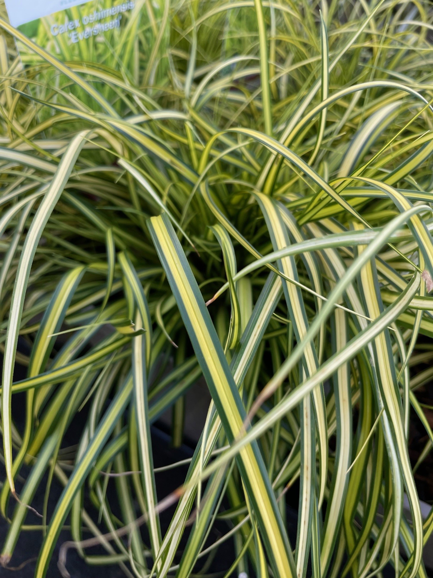 An evergreen ornamental grass which has lime green leaves with green margins and  small spikes of brown flowers in early summer.