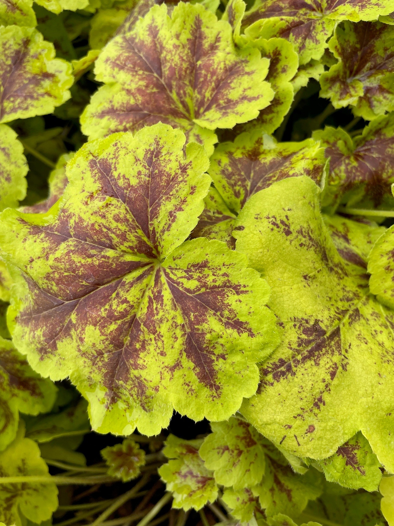 Golden limey green foliage with dark red blotching on a neat mound forming plant. Stays limey green with red blotching in the shade. Foliage deepens in winter. Evergreen