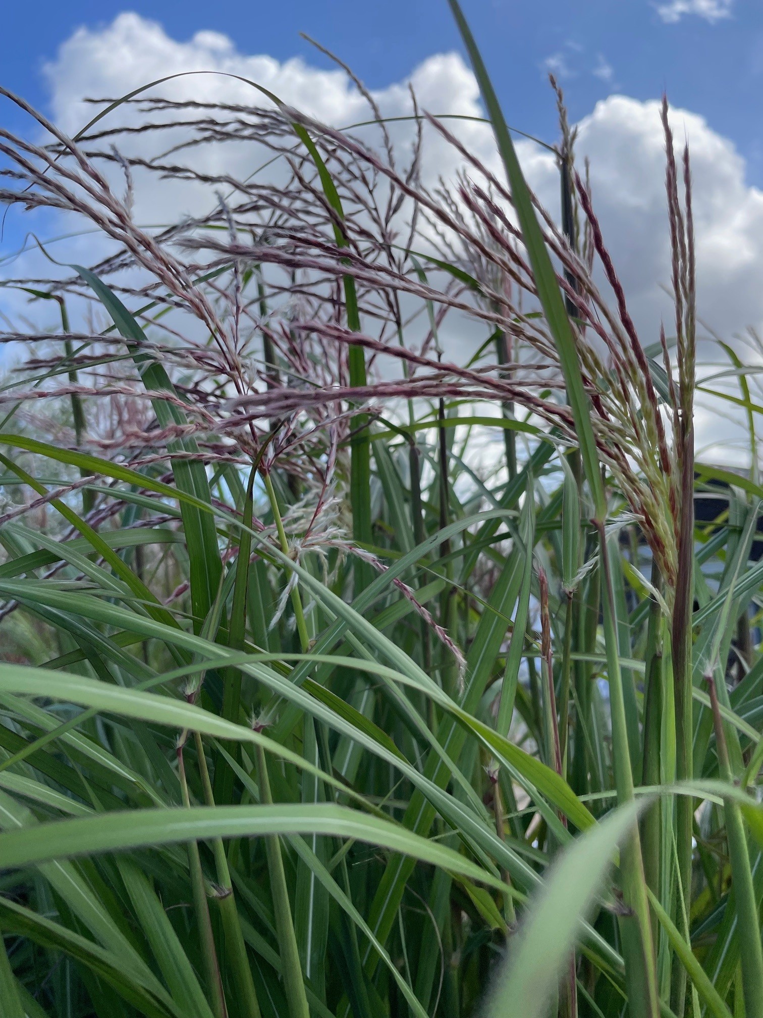 Robust clump forming deciduous grass. Green leaves turning red in autumn with feathery panicles of pin flowewrs during the summer.