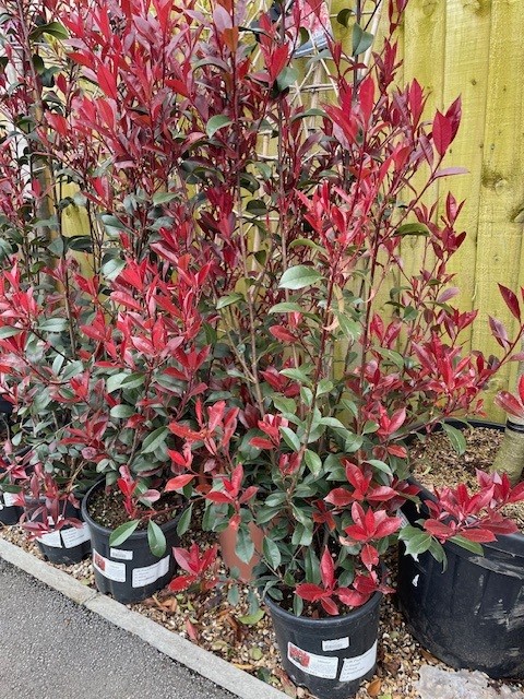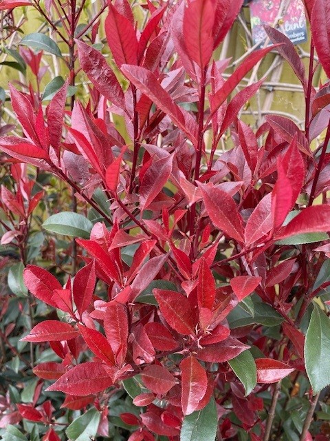 A large, evergreen shrub suitable to use for hedging. Leaves emerge bright red-orange, turning dark green. Panicles of white flowers appear in the summer.
