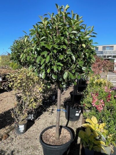 With its red, glossy young foliage, and large, rounded heads of ivory flowers, this evergreen is a popular addition to your garden