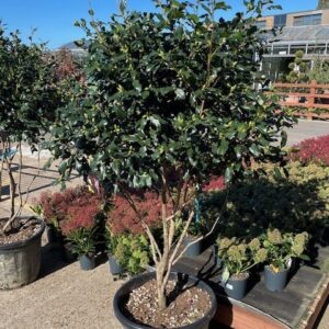 ‘Robusta compacta’ is a large, evergreen shrub. Leaves emerge bright red-orange, turning dark green. Panicles of white flowers appear in the summer.